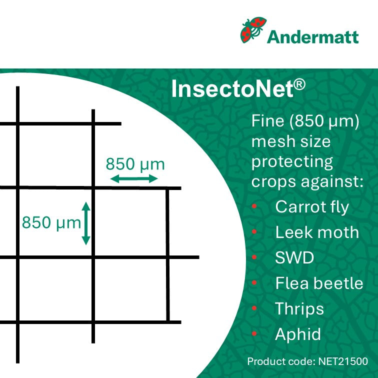 Fine mesh (850µm) to protect crops against a range of insect pests including carrot fly, moths and butterflies, flea beetle, Spotted Wing Drsophila (SWD, Drosophila suzukii), aphid and larger thrip species.