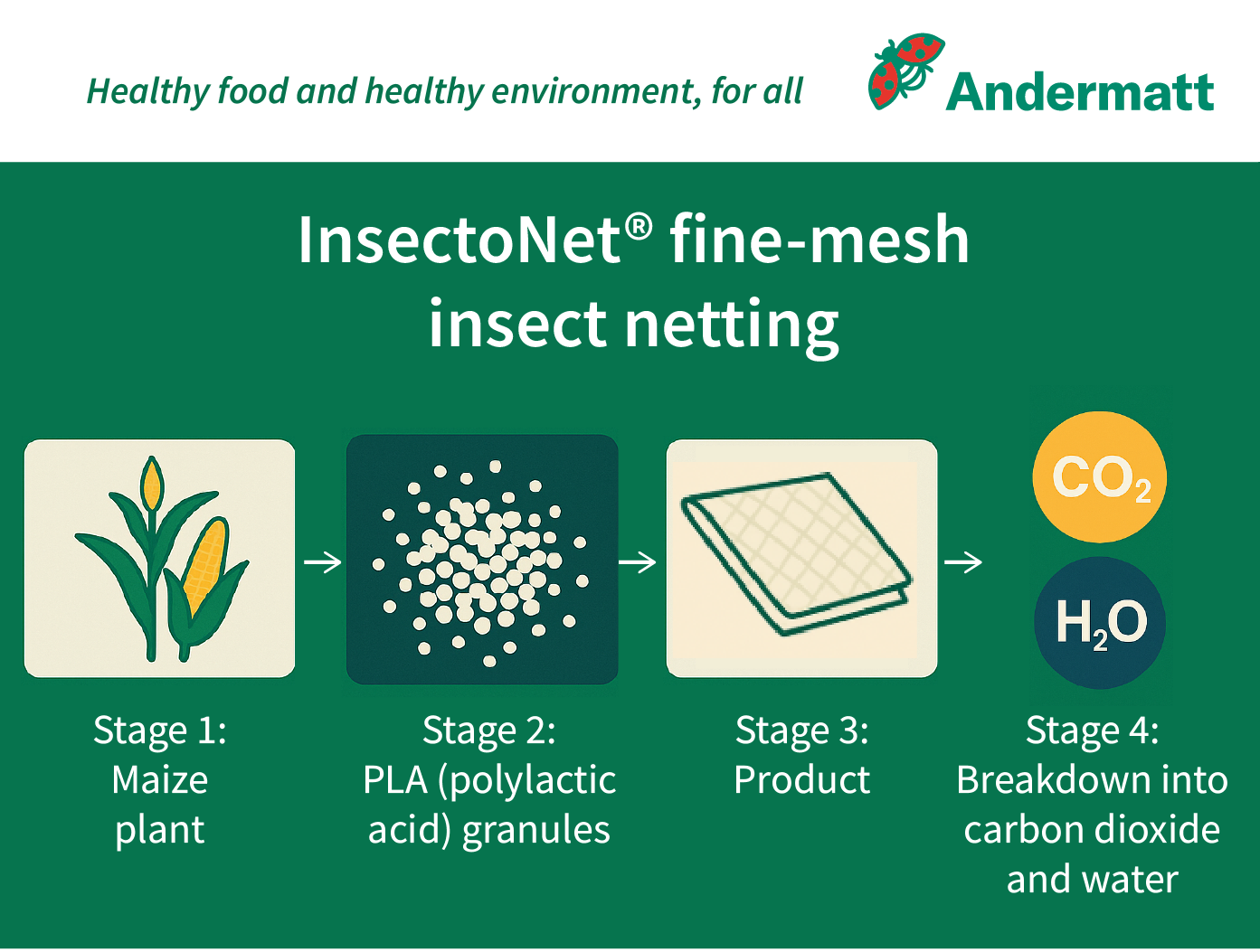 Made from 100% plant-derived material. After its 2-3 years operating life (depending on use and maintenance) InsectoNet is completely biodegradable (according to standard EN 13432).