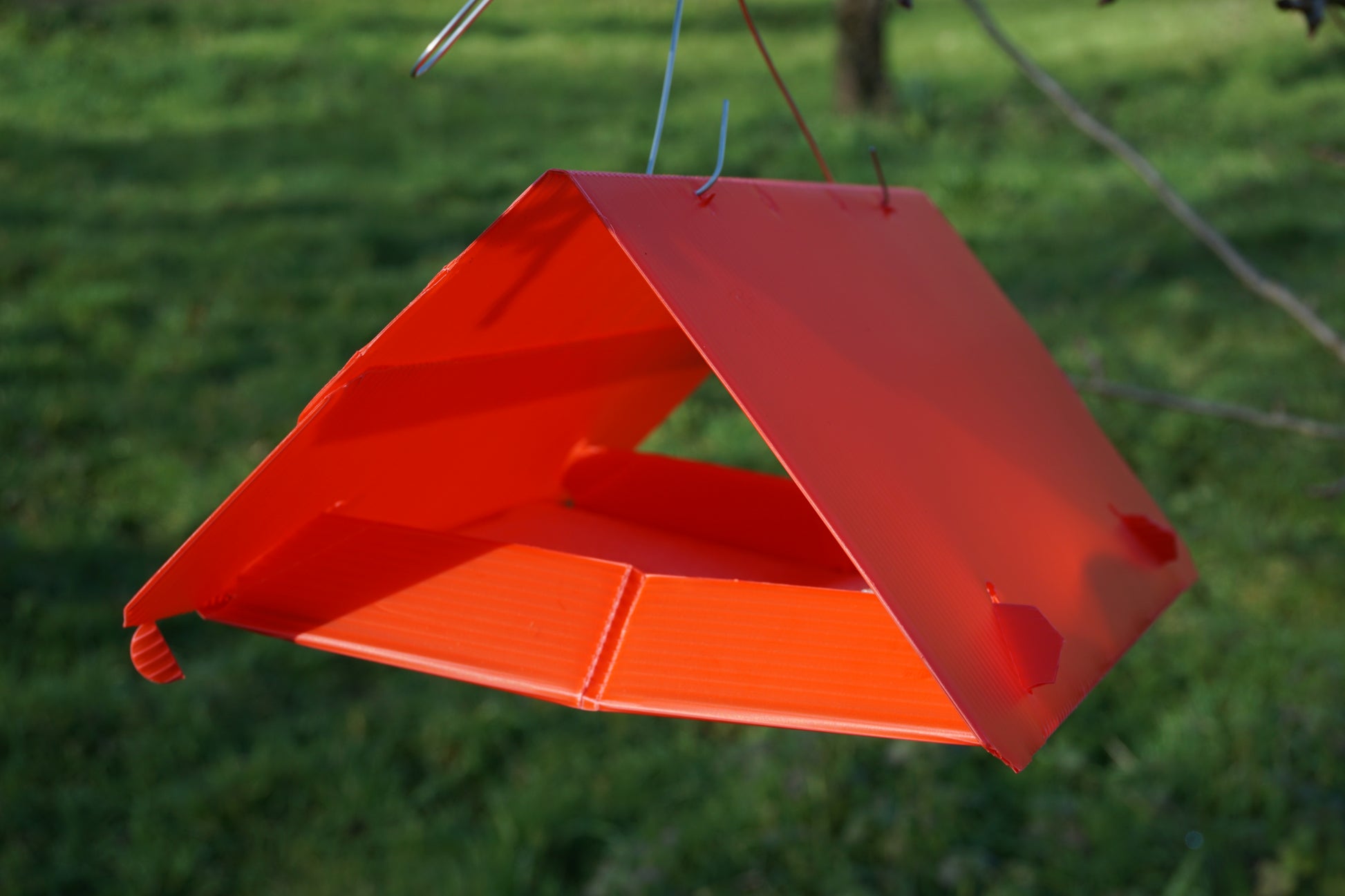 The trap should be hung from a pole within the crop at head height to allow easy access.